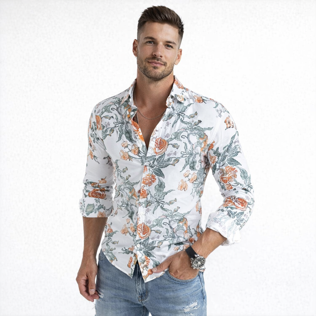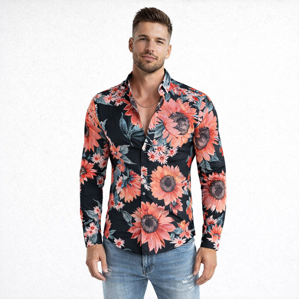 Hawajska Koszula Męska W Kwiaty Długi Rękaw