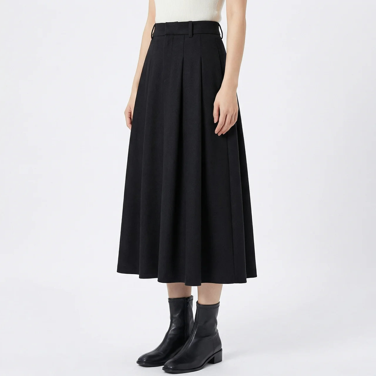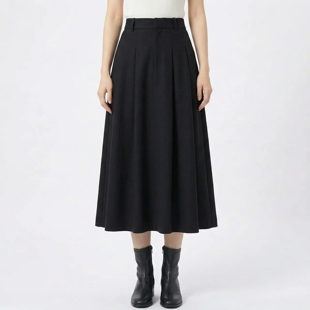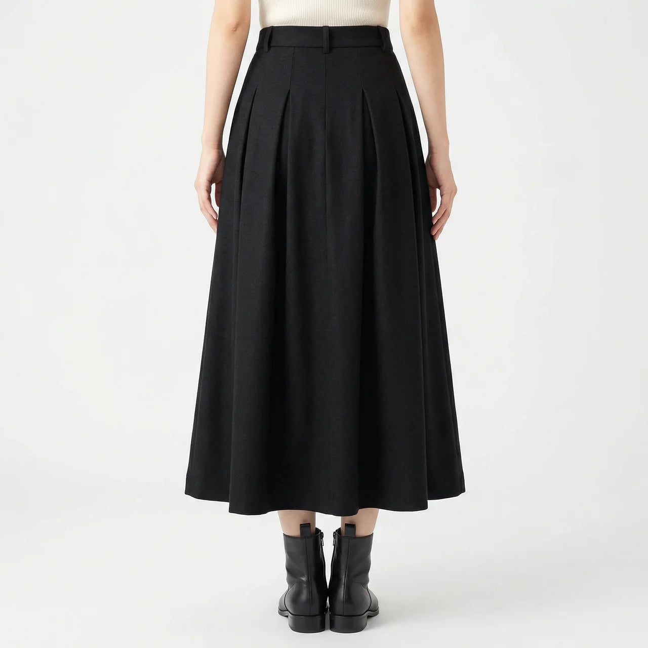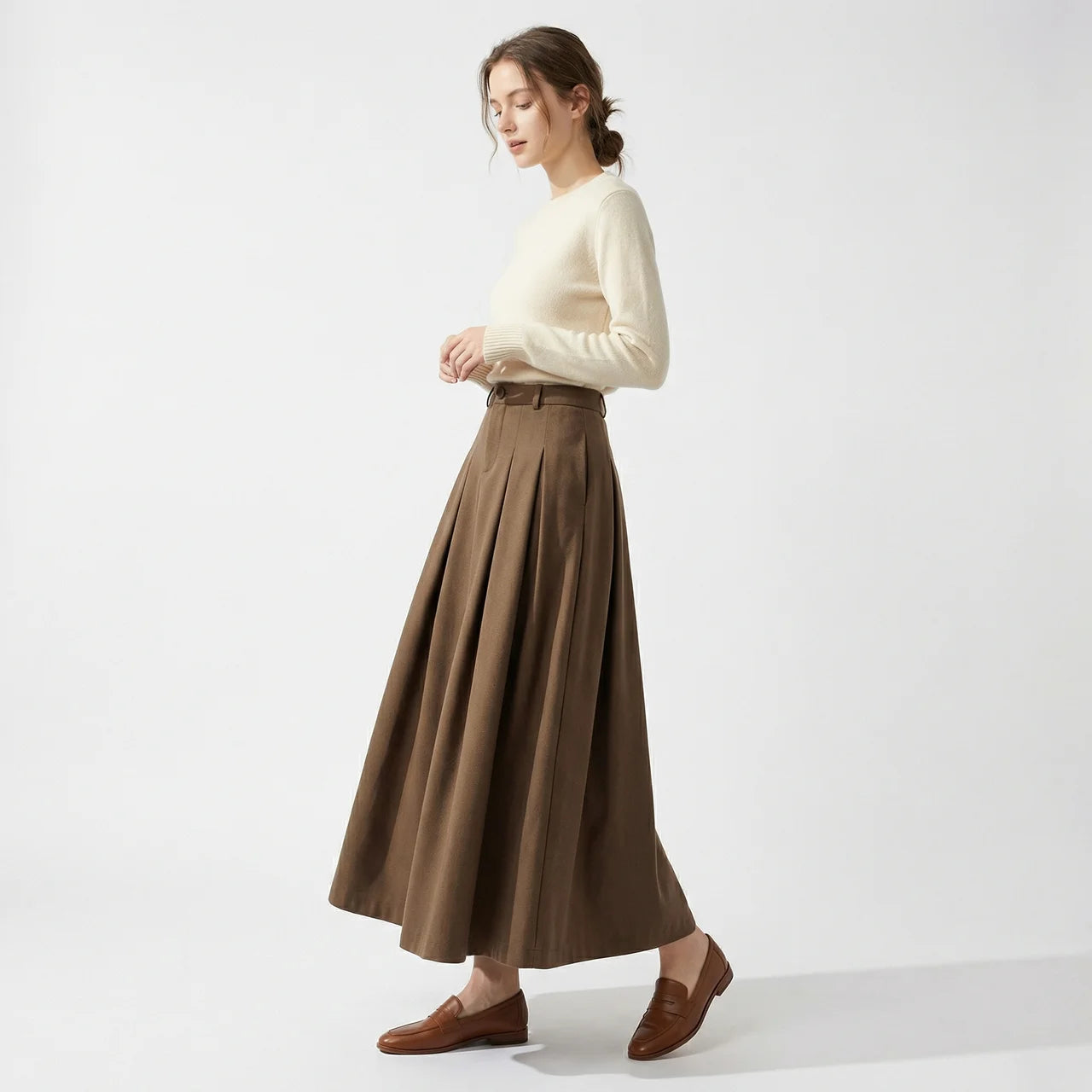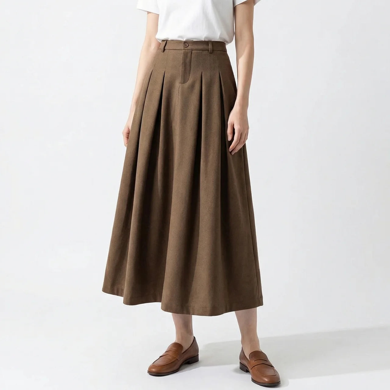 Ta rozkloszowana spódnica midi to prosty sposób na stylizację, która wygląda schludnie bez zbędnego wysiłku. Delikatnie rozszerzany krój tworzy harmonijną linię i dobrze układa się w ruchu. Noś ją ze swetrem, koszulą lub dopasowanym topem — sprawdzi się zarówno na co dzień, jak i przy bardziej wyjściowych okazjach.