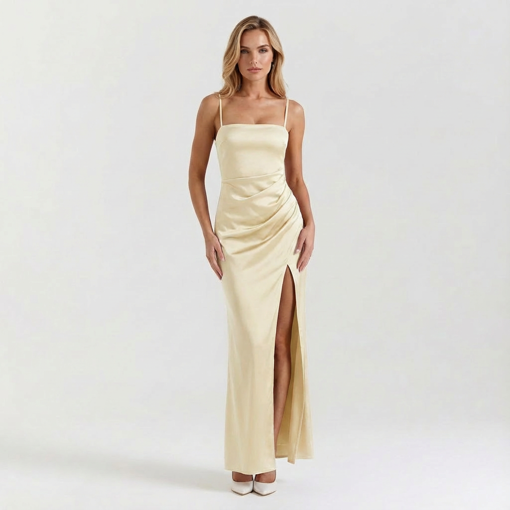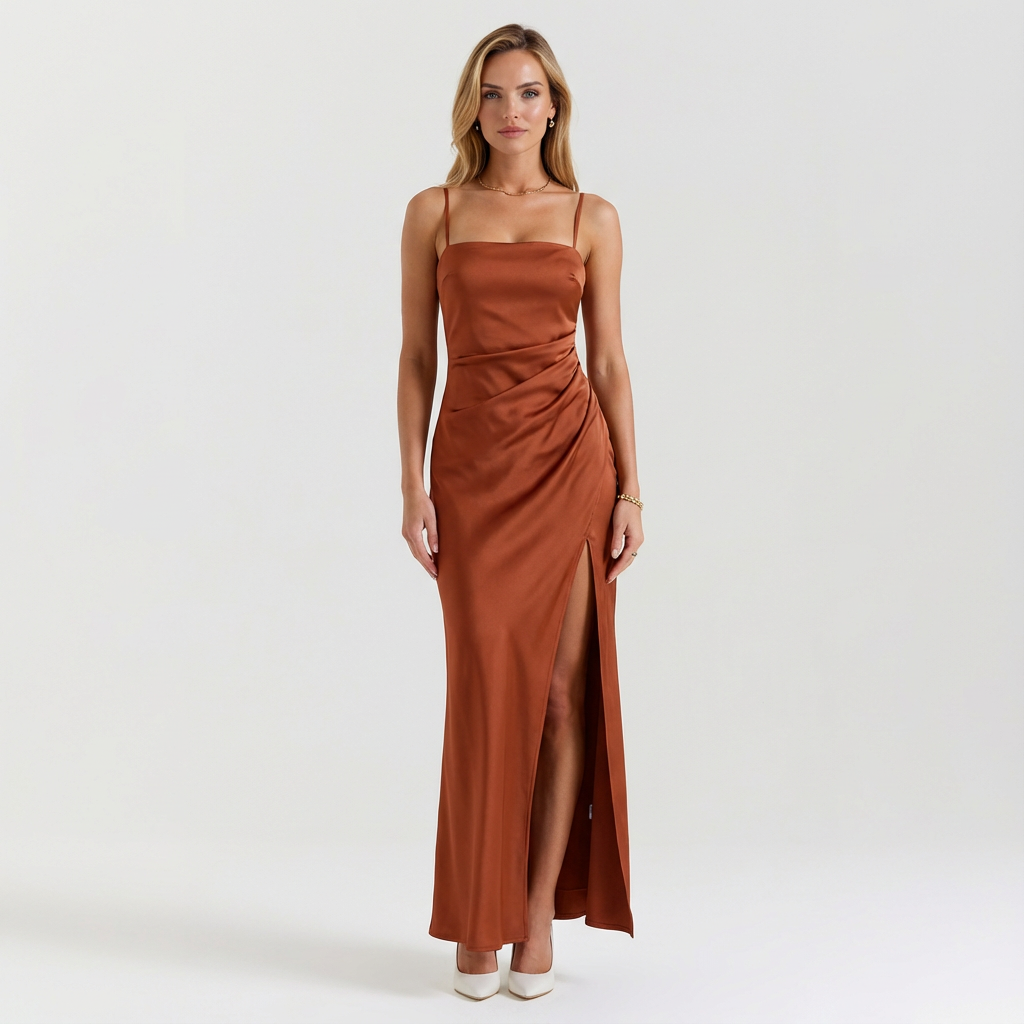 Ta sukienka maxi na cienkich ramiączkach została stworzona z myślą o ciepłych dniach i dopracowanych wieczornych stylizacjach. Prosta forma w połączeniu z wysokim rozcięciem z boku nadaje całości nowoczesny, a jednocześnie ponadczasowy charakter. Model sprawdzi się zarówno podczas urlopu, jak i na wieczorne spotkania.