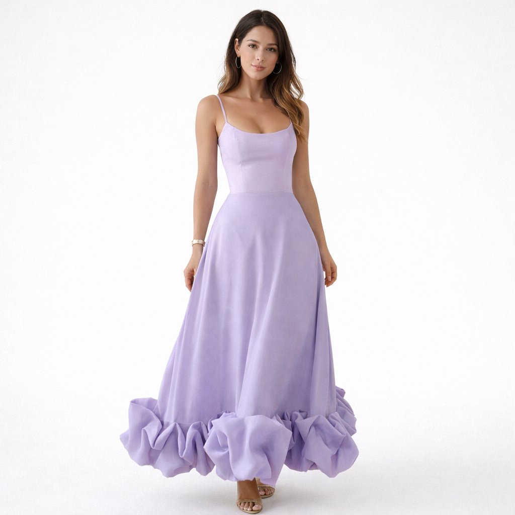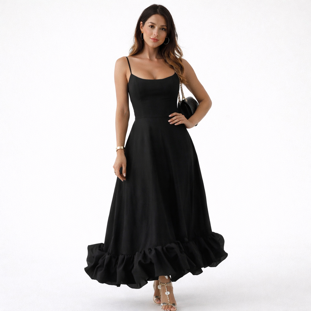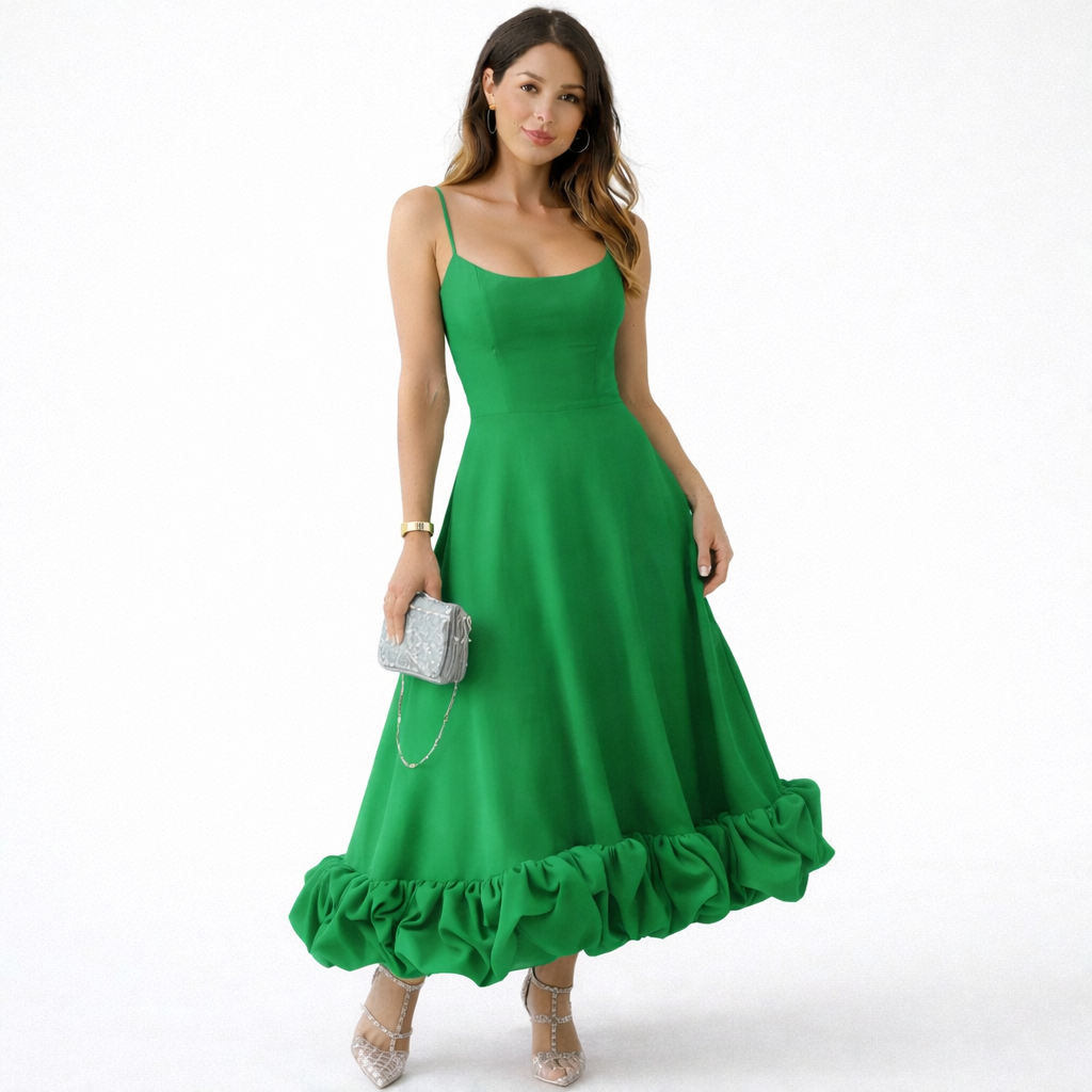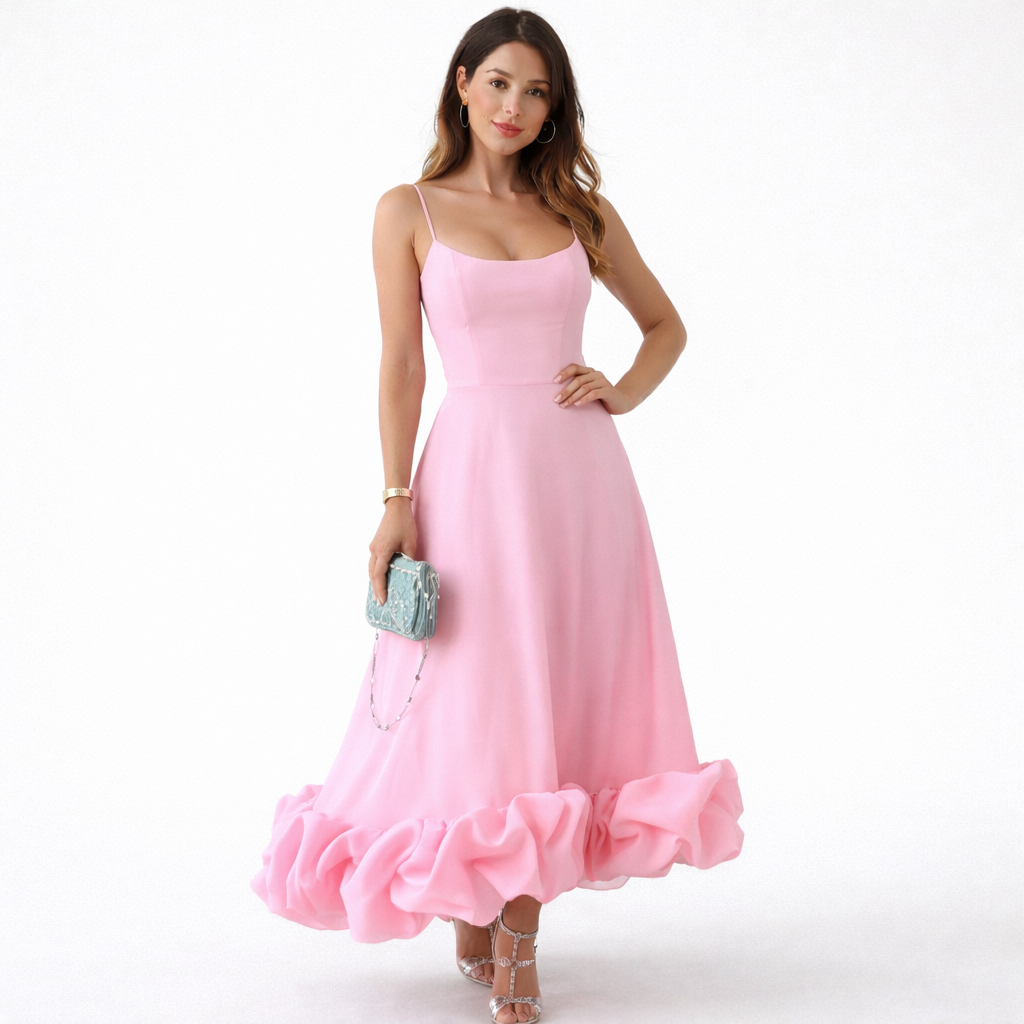 Wybierz romantyczną sukienkę midi stworzoną na ciepłe dni i uroczystości w Polsce. Dopasowana góra z delikatnie ukształtowanym dekoltem podkreśla sylwetkę, a cienkie ramiączka dodają całości subtelnego charakteru. Zwiewny dół zakończony efektowną falbaną wprowadza ruch, dlatego świetnie sprawdza się na weselach, przyjęciach i letnich wydarzeniach.