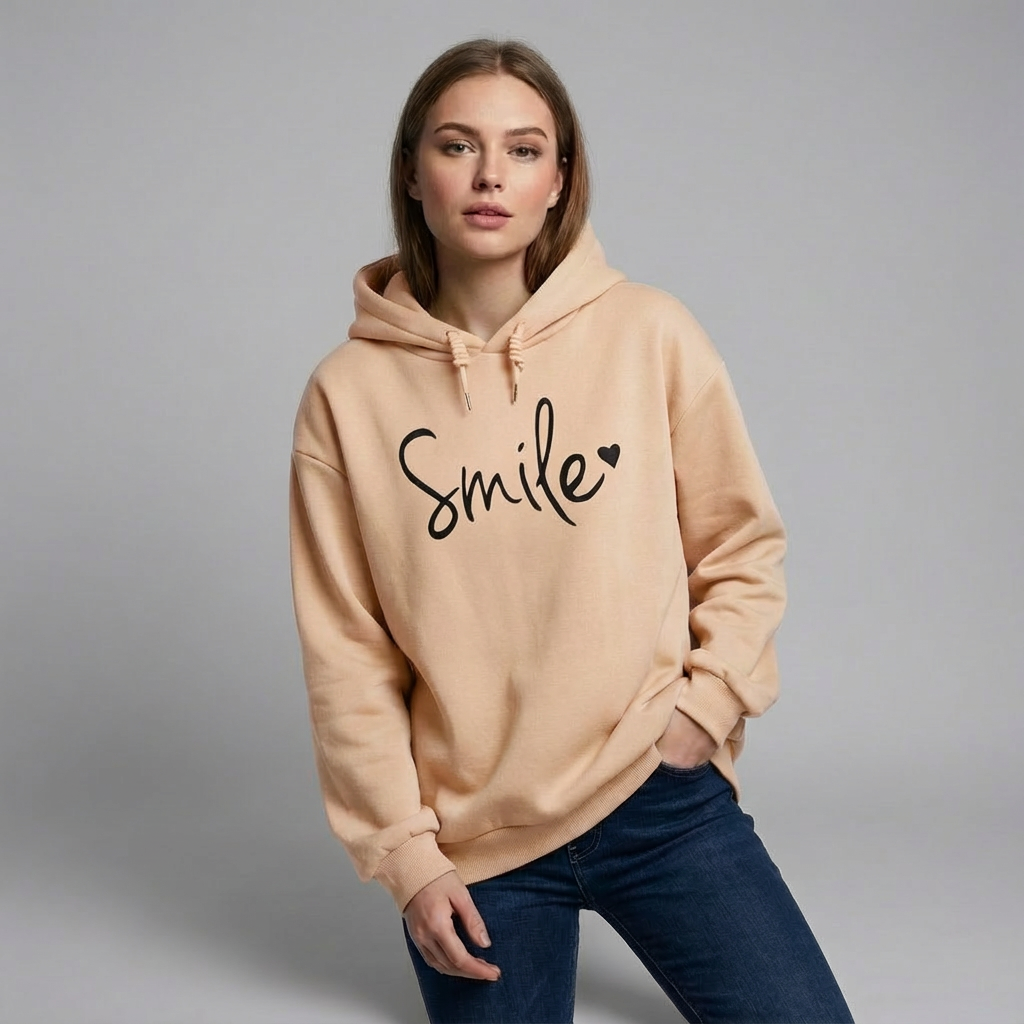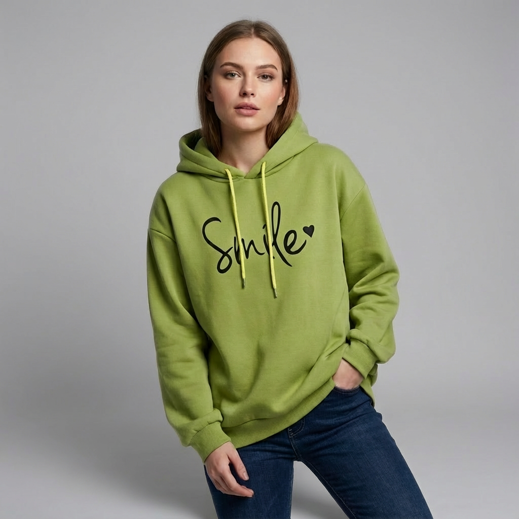 Ta bluza z kapturem wyróżnia się pogodnym motywem uśmiechu umieszczonym na przodzie. Dodaje stylizacjom lekkości i pozytywnego charakteru, sprawdzając się zarówno w codziennym użytkowaniu, jak i podczas spokojnych wyjść czy relaksu w domu. Prosty krój ułatwia łączenie bluzy z różnymi elementami garderoby.
