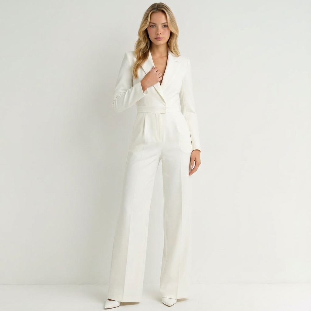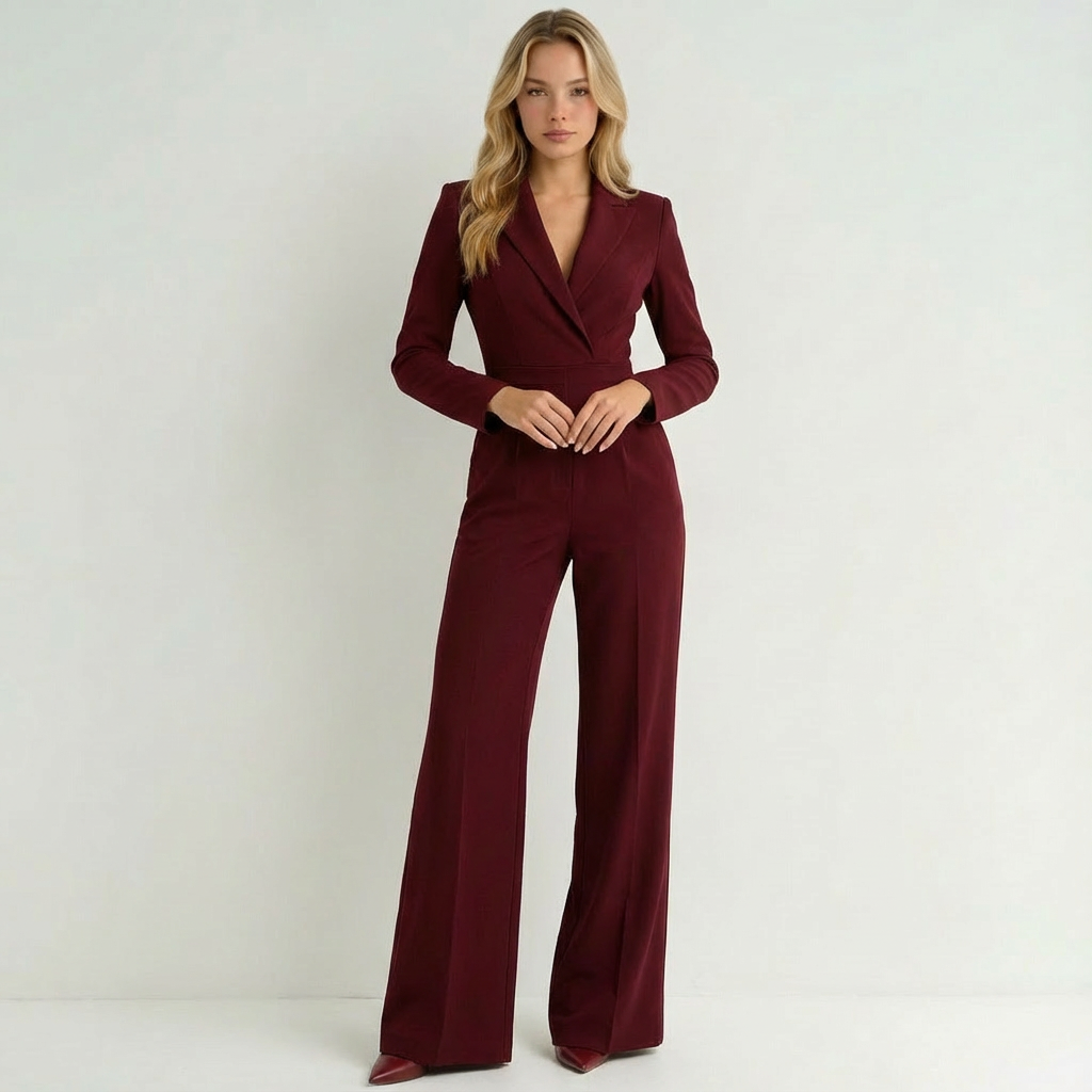 Ten damski kombinezon został zaprojektowany z myślą o wyrazistej, uporządkowanej sylwetce. Kopertowy przód i długie rękawy nadają całości eleganckiej formy, a szerokie nogawki optycznie wydłużają figurę. To uniwersalny wybór do pracy, na spotkania formalne oraz wieczorne wyjścia.